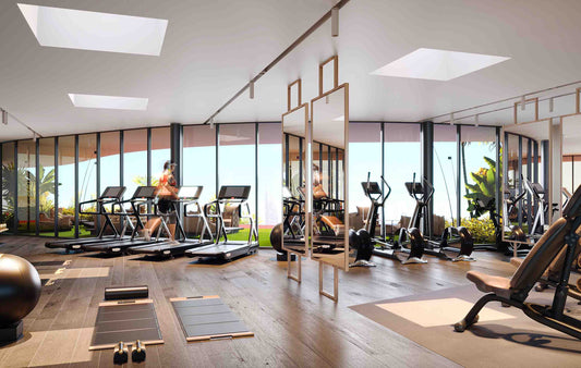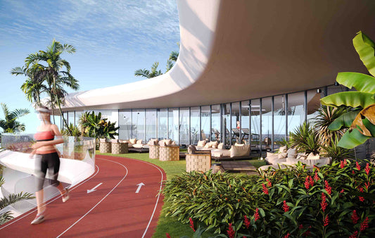 The rooftop is designed as a wellness oasis, with a panoramic gym, surrounded by greenery, lush gardens and a running track to provide guests with a rejuvenating experience without having to leave home.
