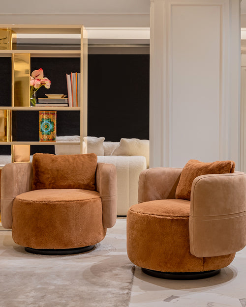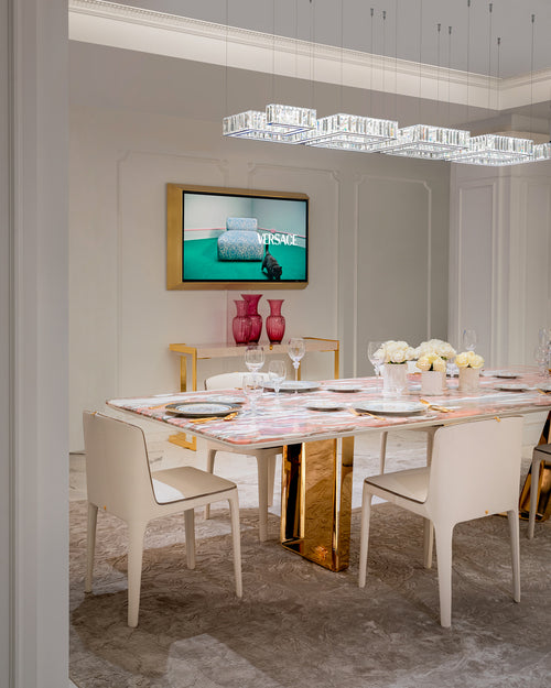 Il rinnovato ambiente mette in scena un dialogo tra le icone definitive di Versace e l’architettura audace della collezione 2025. Il divano Zensational, proposto in un candido bianco, e il tavolo La Medusa con top in marmo Fiordo Rosa, si affiancano alle nuove creazioni 2025: le poltrone Elite, il divano Palace dalla forte presenza scultorea e il divano Drop, espressione di una modernità fluida. Ogni pezzo riflette l’approccio deciso del brand alla forma e alla materia.