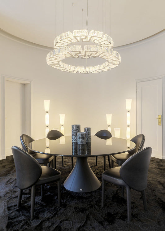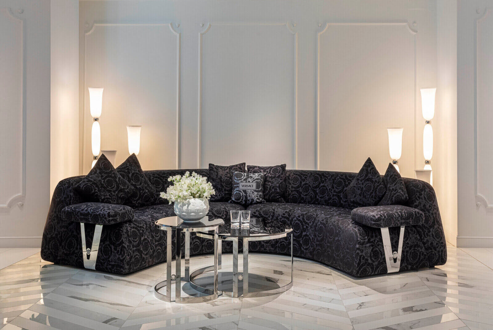 Gli elementi d’arredo si animano sul palcoscenico dell’abitare disegnando gli ambienti con forme avvolgenti. Il mondo Versace si rivela, stanza dopo stanza, in un susseguirsi di atmosfere che raccontano la sua straordinaria capacità di attingere dalle diverse espressioni d’arte per trasformarle in un sogno.