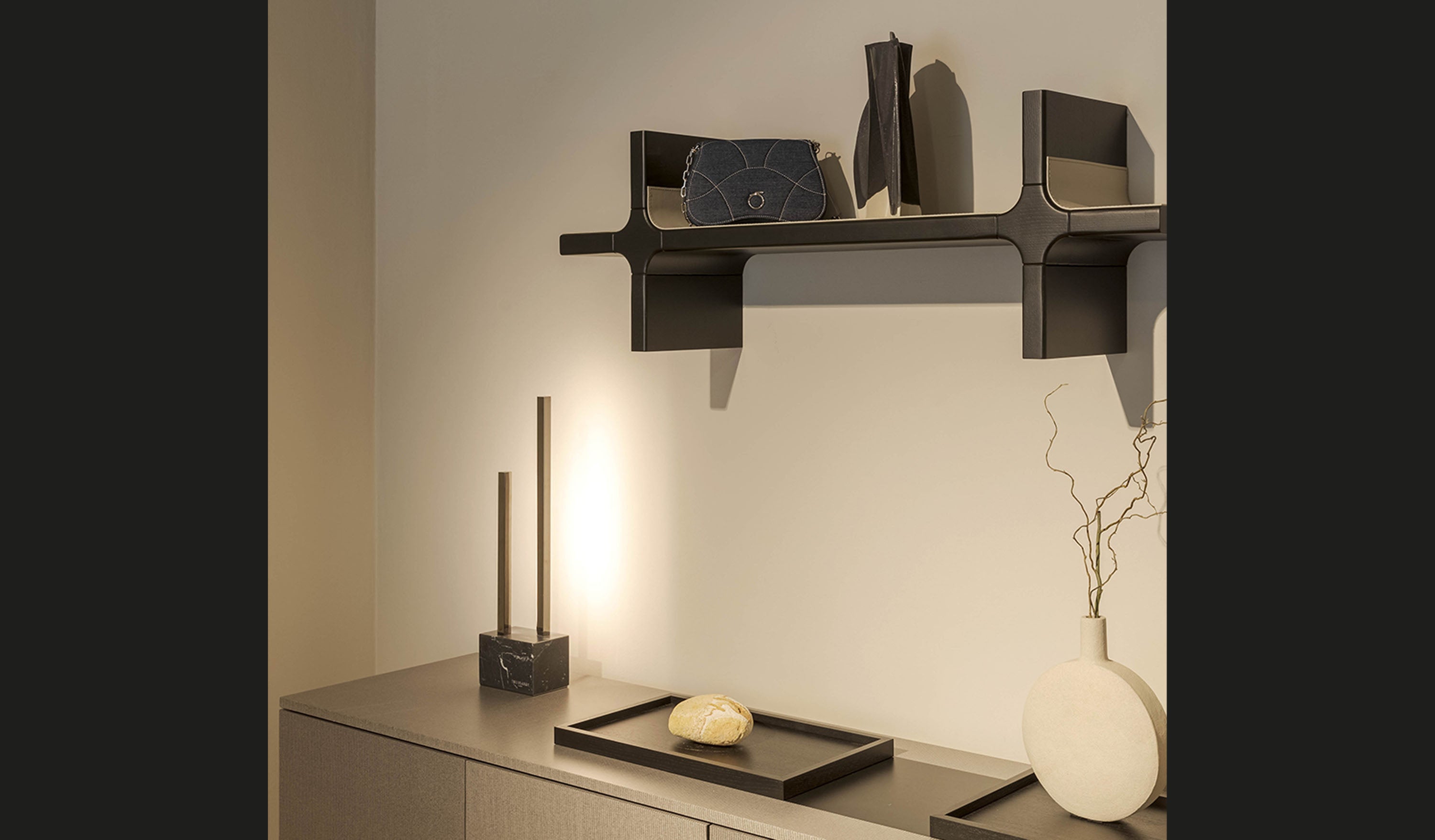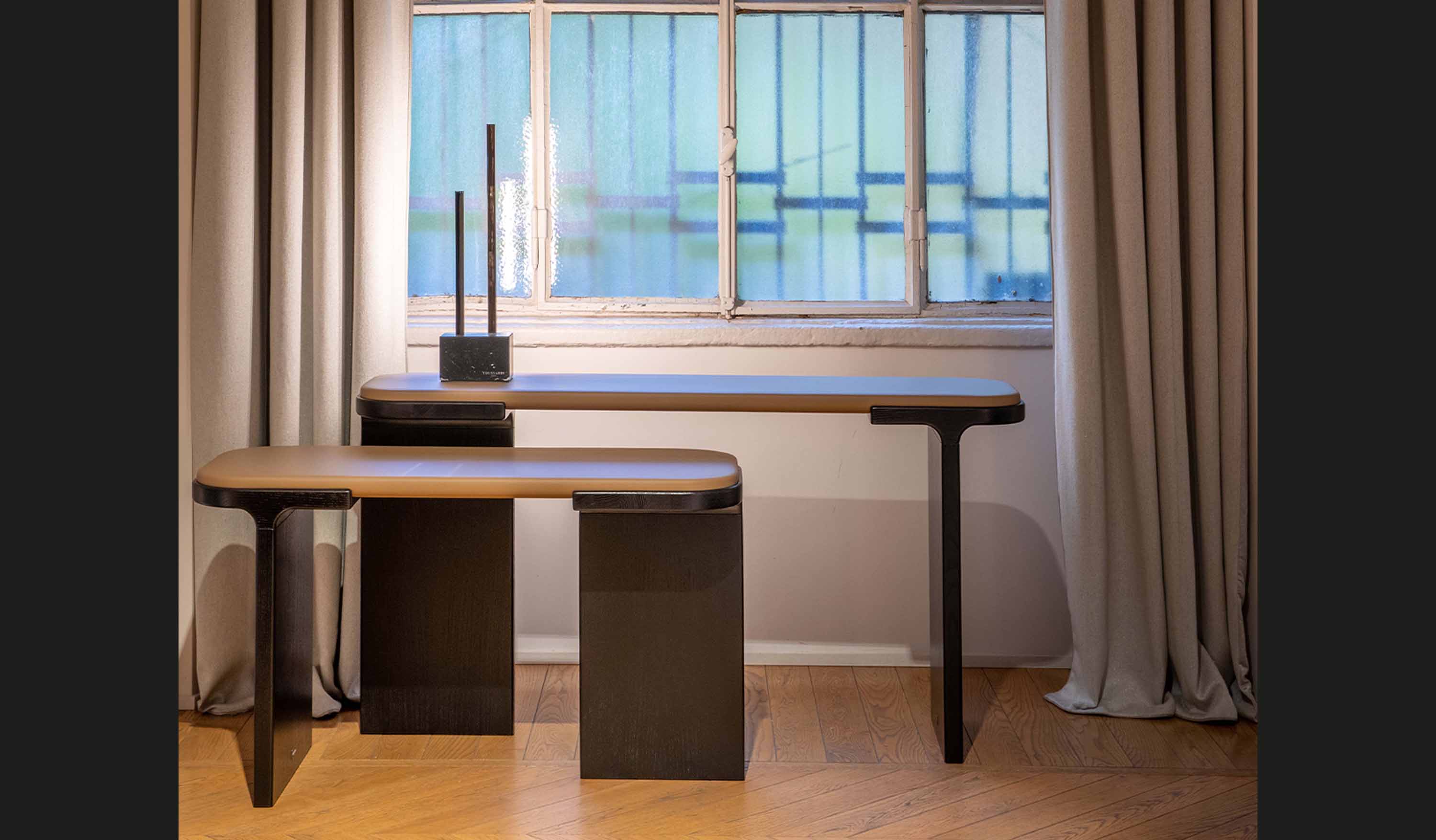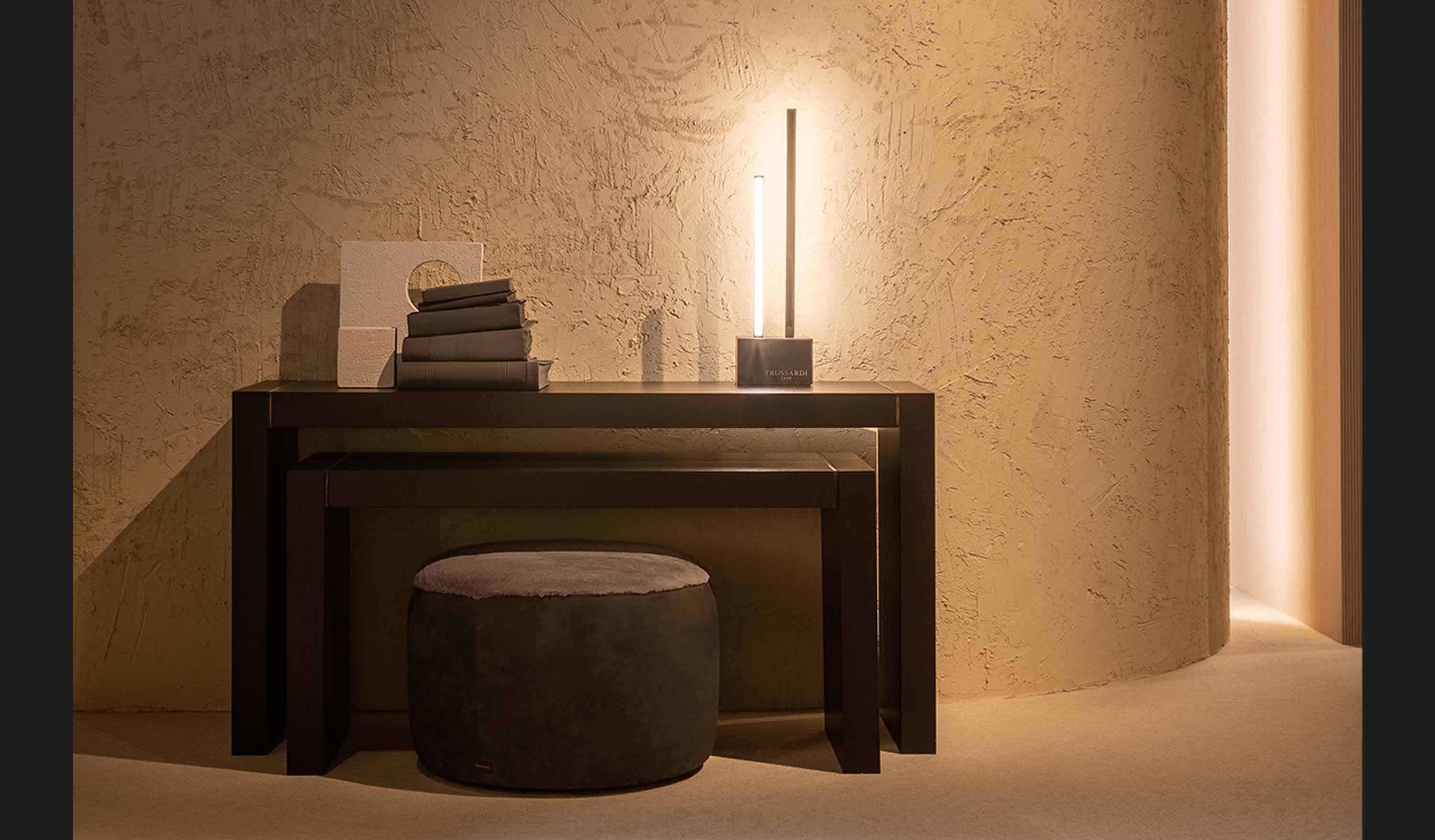 Il suo stile si basa su elementi verticali disallineati, (in profili metallici con finitura galvanica gun metal che racchiudono il led e ne che amplificano i riflessi di luce. La base o i supporti, sono realizzati in marmo nero Marquina, levigato fino a ottenere una finitura opaca satinata, aggiungono un tocco di lusso raffinato.