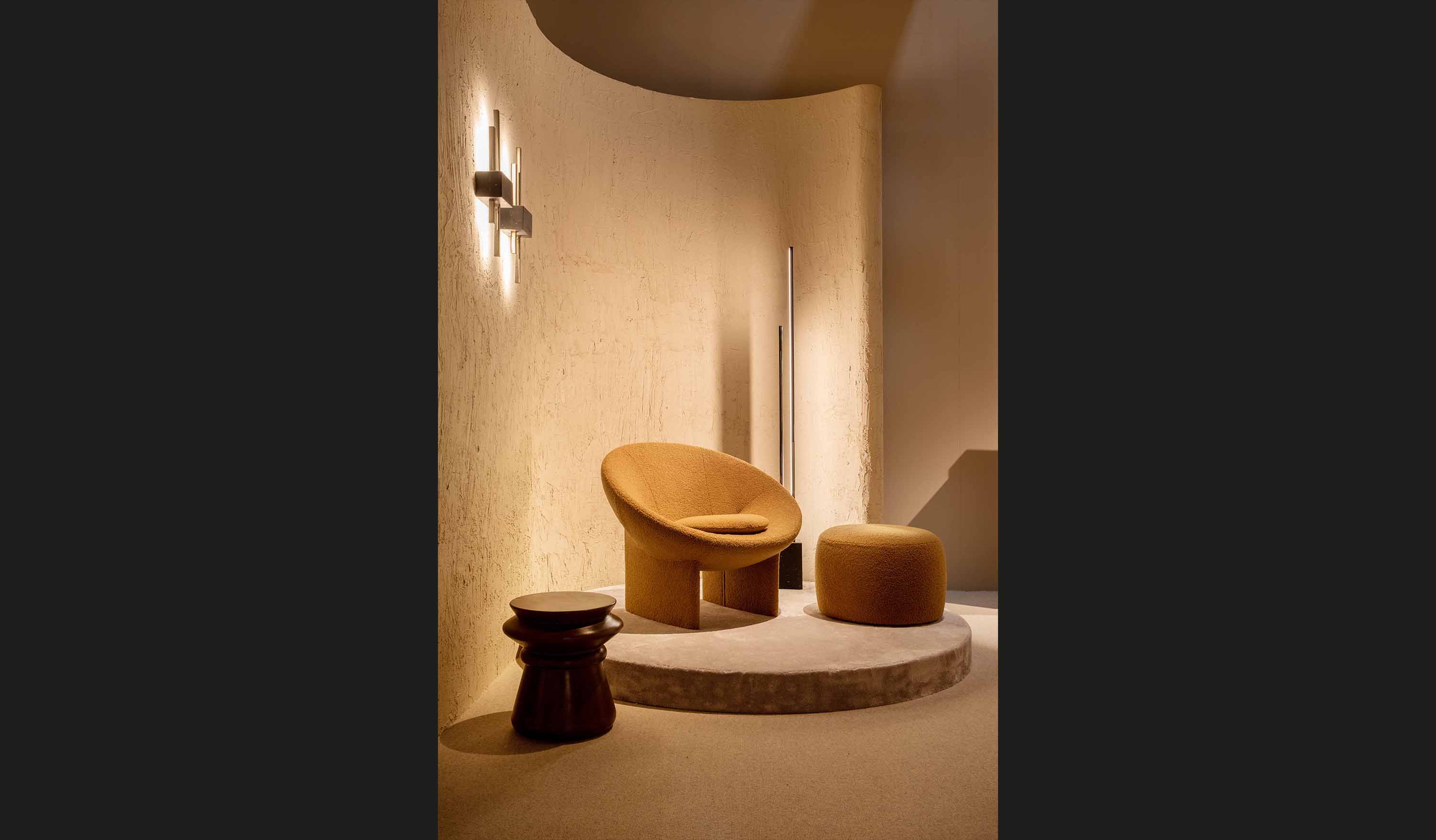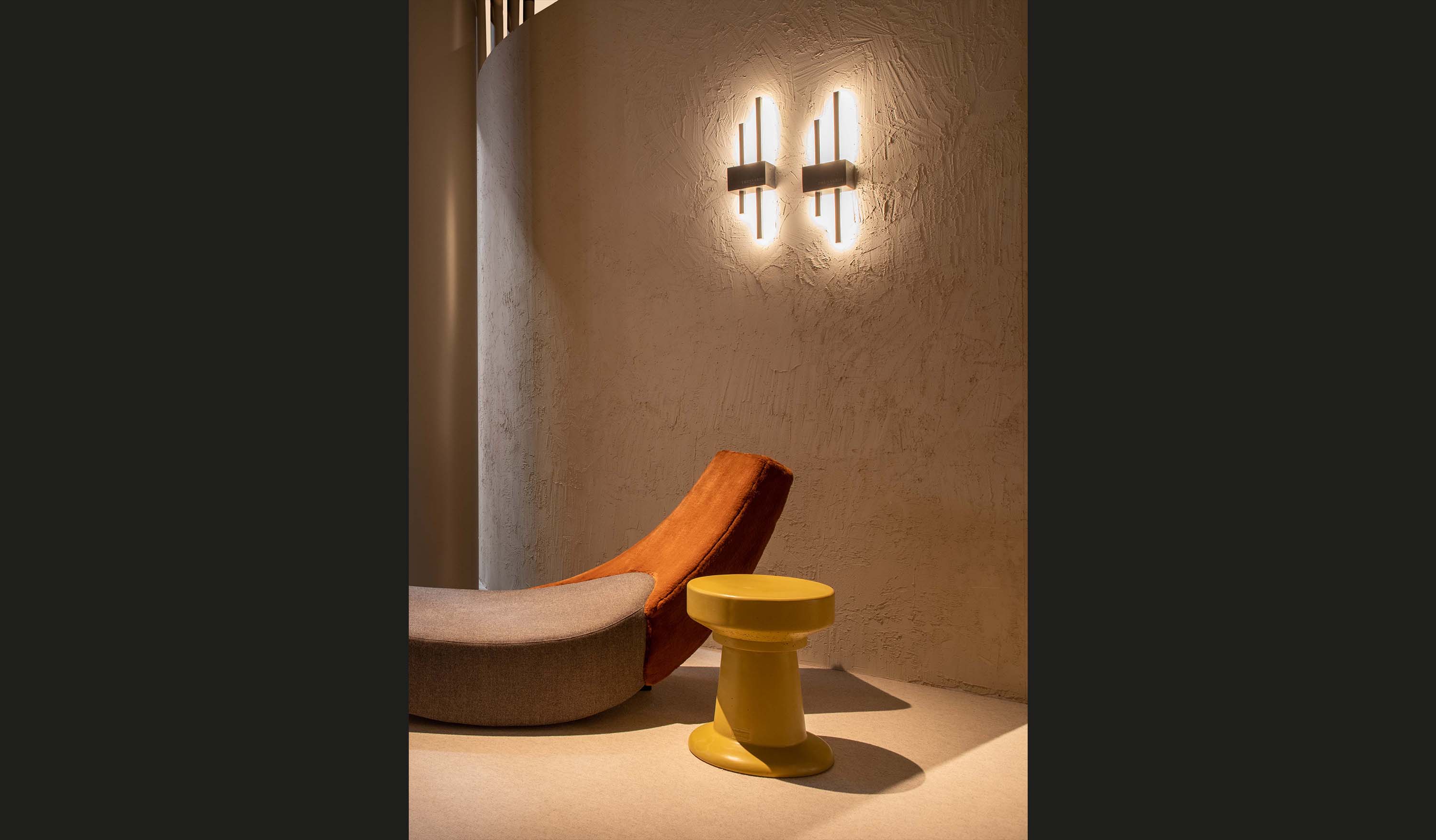 Il suo stile si basa su elementi verticali disallineati, (in profili metallici con finitura galvanica gun metal che racchiudono il led e ne che amplificano i riflessi di luce. La base o i supporti, sono realizzati in marmo nero Marquina, levigato fino a ottenere una finitura opaca satinata, aggiungono un tocco di lusso raffinato.