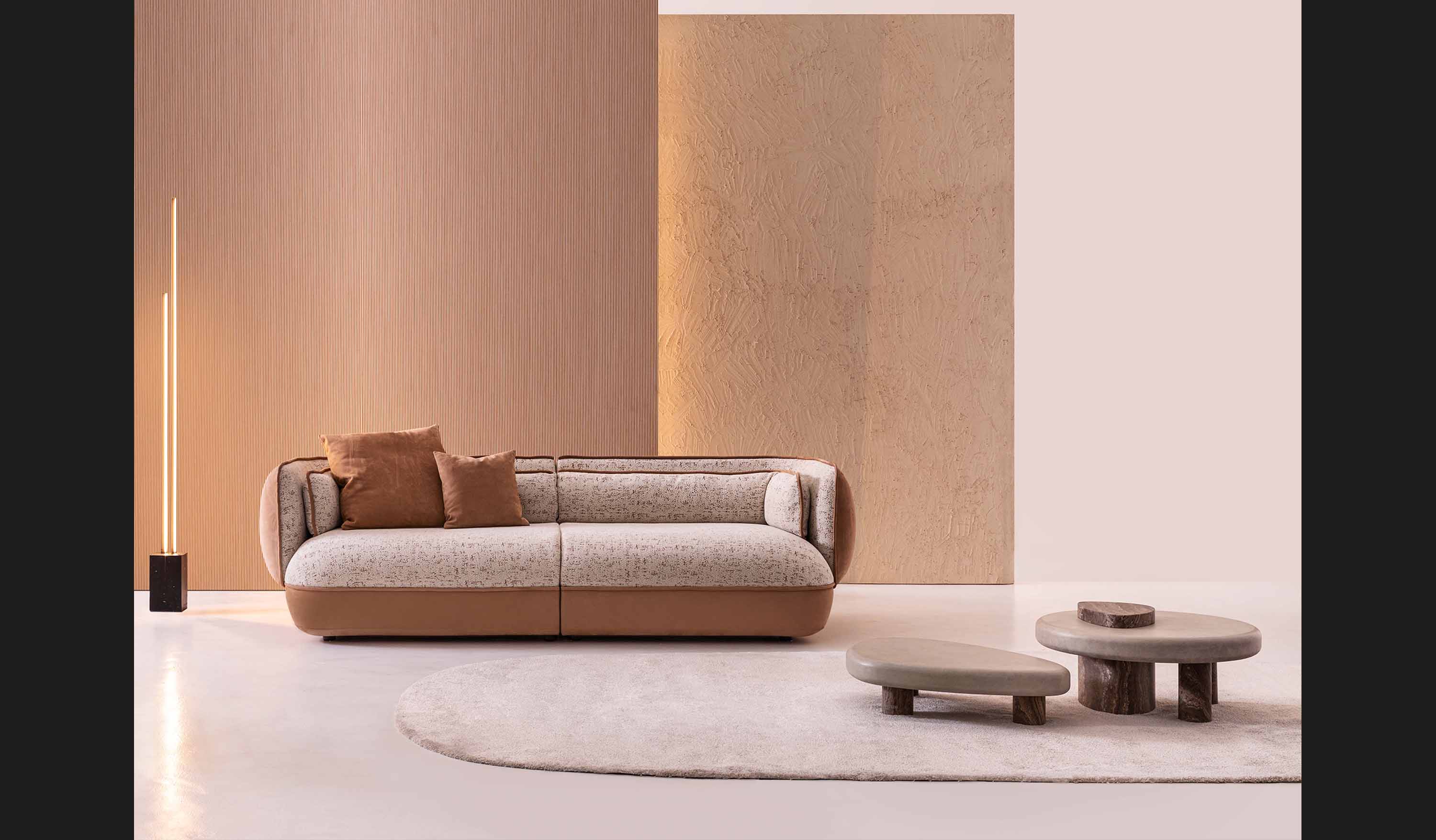 Il divano Nebula nasce dal dialogo tra tradizione e ironia, elementi che i designer traducono in un linguaggio estetico inaspettato. I volumi sono essenziali ma ricchi di carattere, sovrapposti e accostati come sculture domestiche. La testura fluida dello schienale e del cuscino poggia-reni richiama il profilo iconico della borsa clutch, un dettaglio che unisce estetica sartoriale e funzionalità ergonomica.