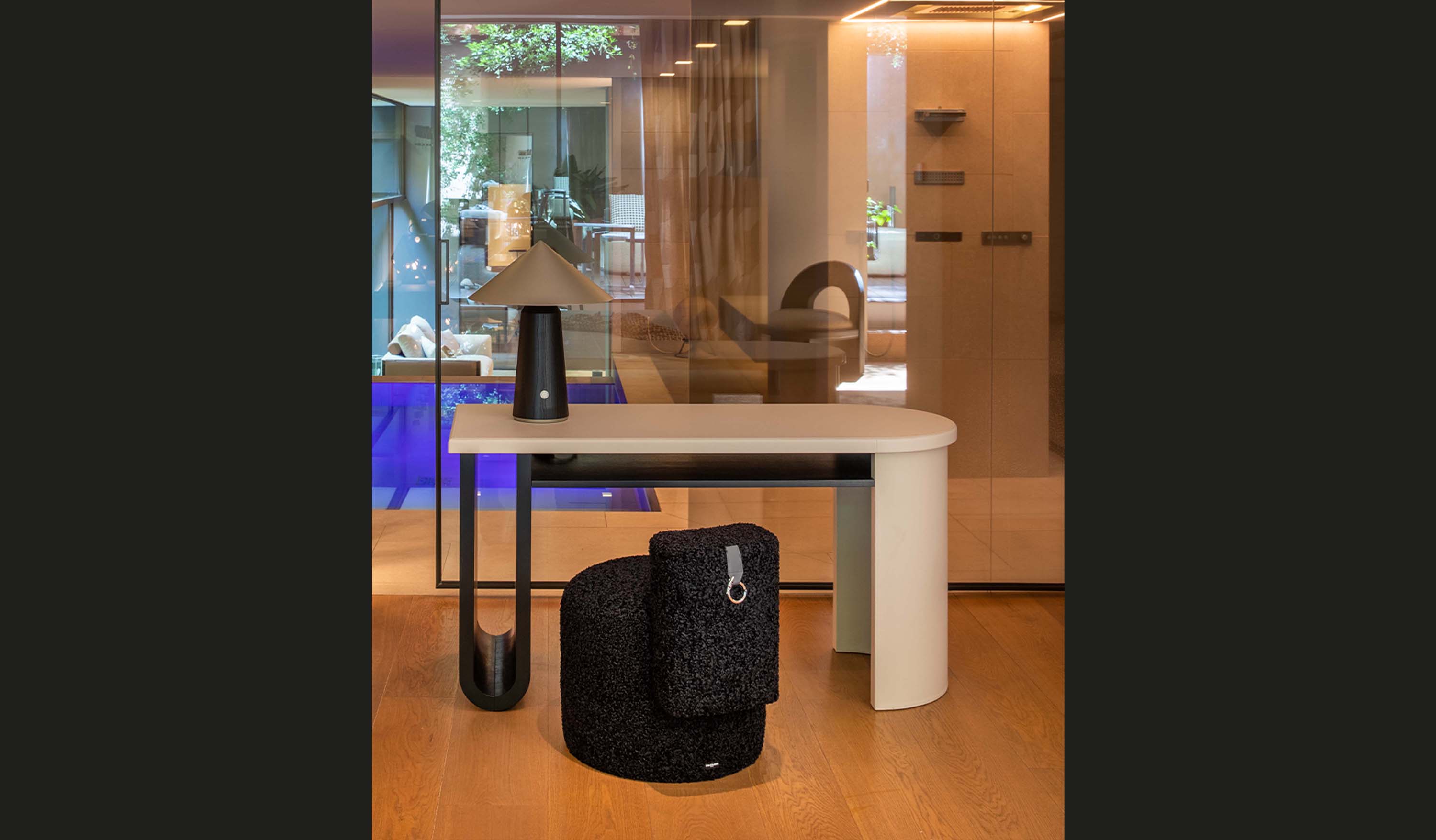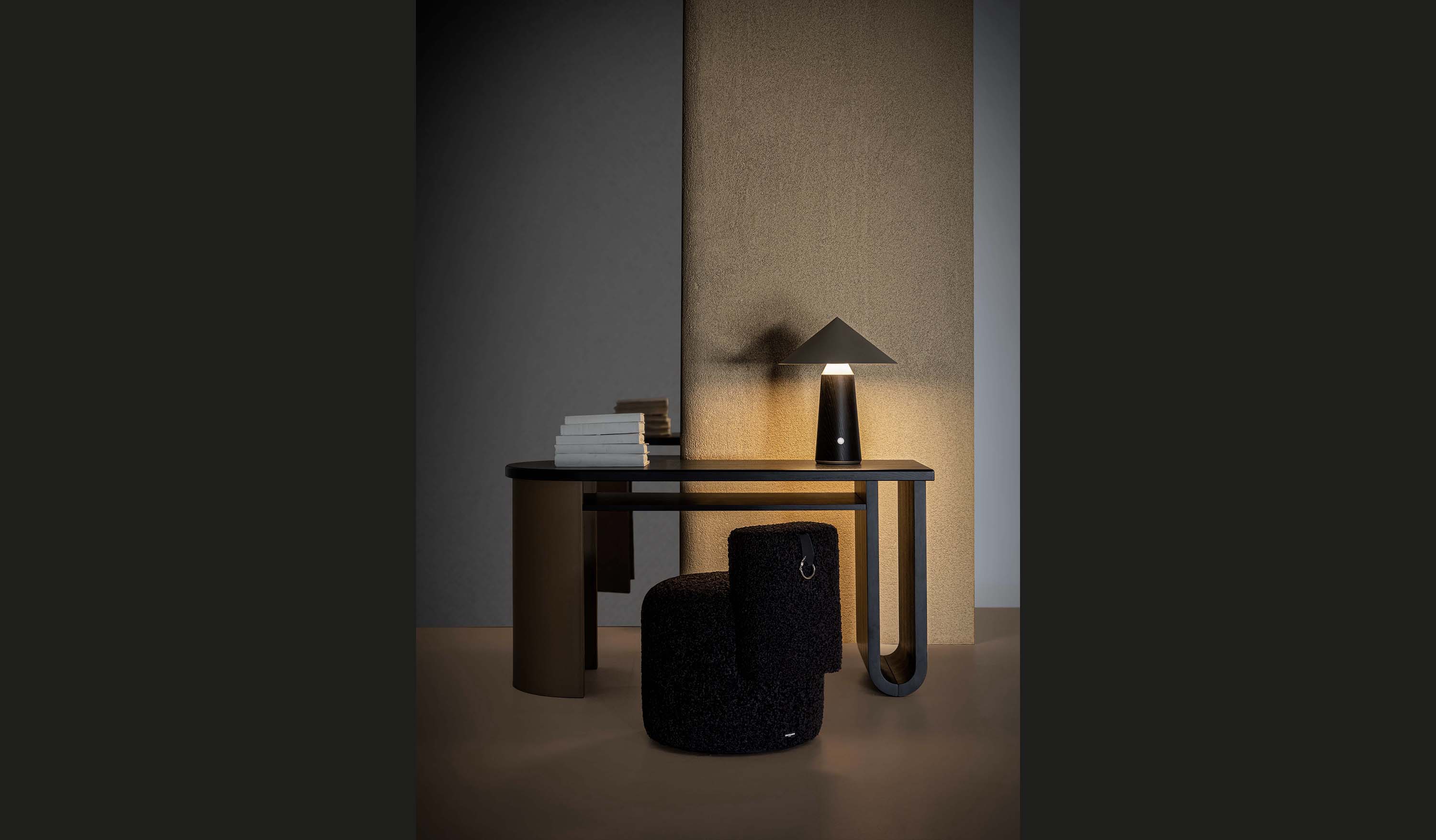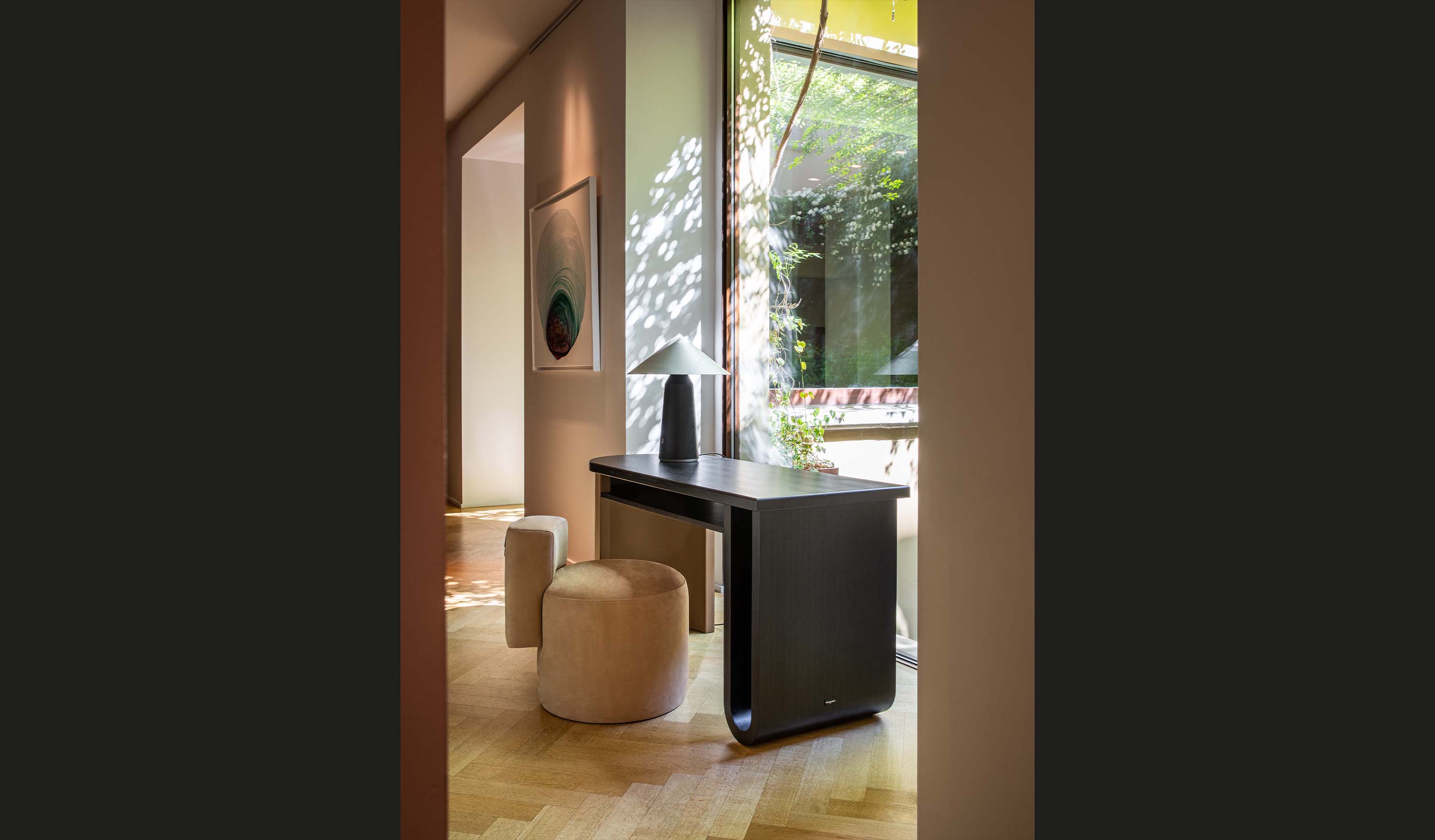 Reinterpretando l’archetipo dello scrittoio con un linguaggio essenziale, fonde solidità e leggerezza. I volumi pieni si alternano a cavità in un gioco di geometrie ispirato all’architettura romana, dove l’arco rovesciato e il mezzo cerchio definiscono una struttura visivamente equilibrata e dinamica.
