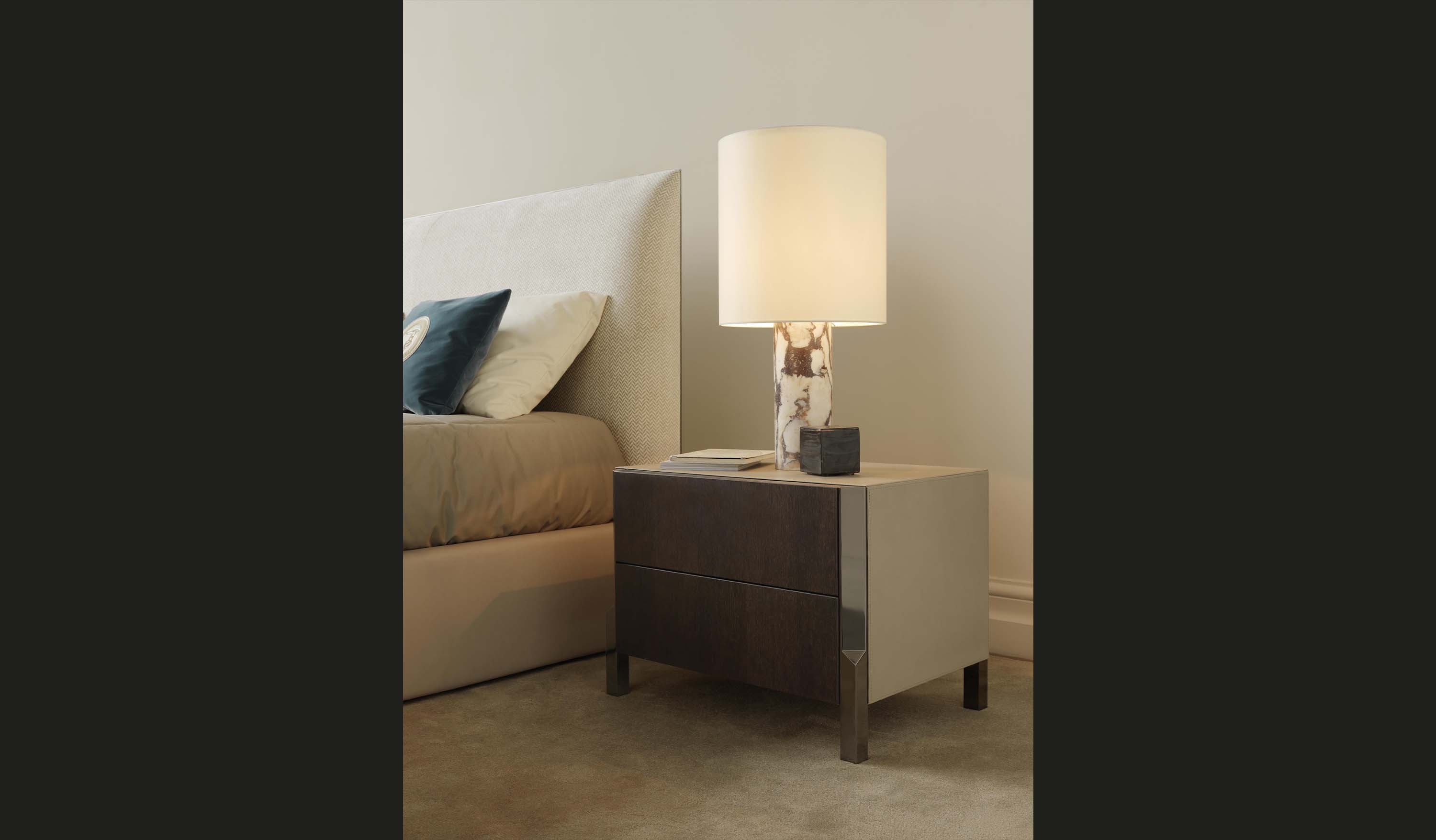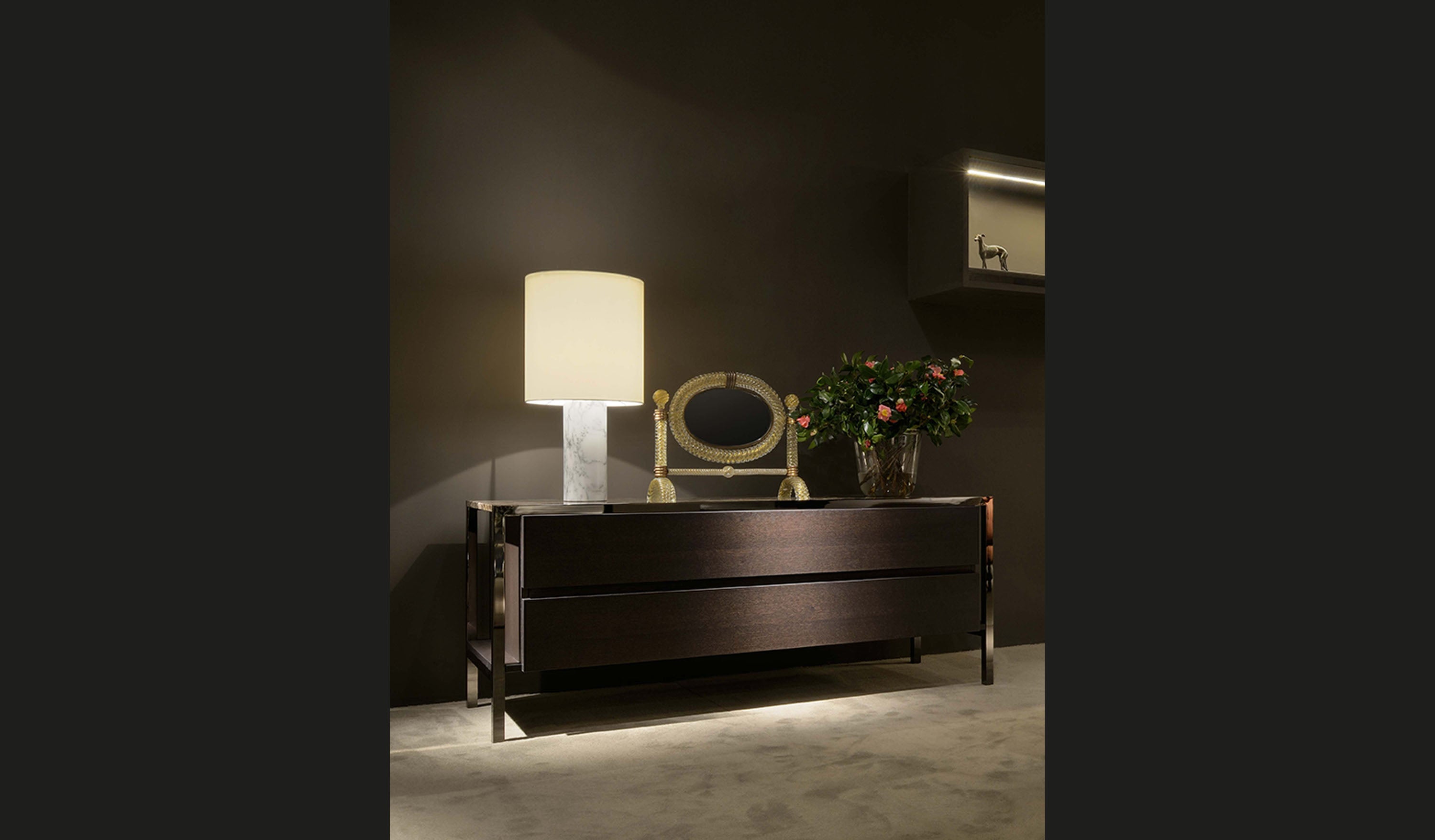 La base scolpita in marmo, disponibile nelle preziose varianti Bianco Carrara o Breccia Medicea con finitura lucida, è un omaggio alla tradizione artigianale italiana, mentre il paralume in delicato tessuto avorio "effetto luce calda" diffonde quel senso di familiarità e di atmosfere rilassate, indissolubilmente legate al life style di Trussardi casa.