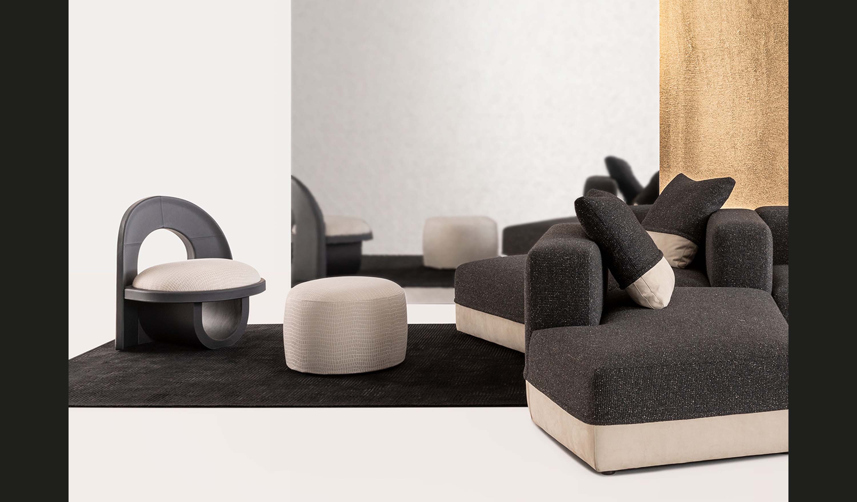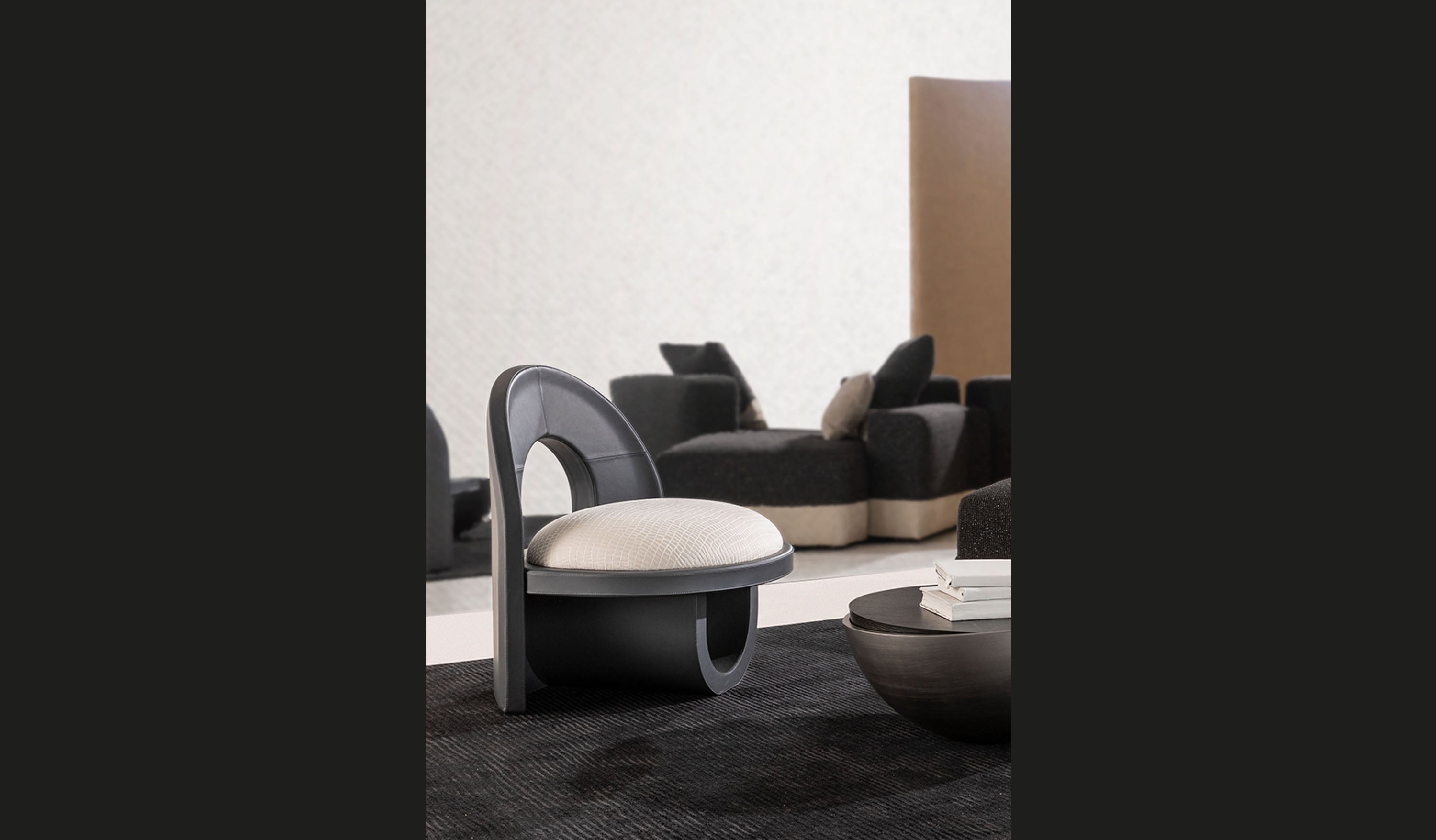 La sua estetica nasce dall’unione speculare di due archi: uno rivolto verso l’alto, che richiama la dolcezza di un tramonto, e l’altro verso il basso, metafora del suo riflesso. Questa geometria, interrotta dal cuscino che simboleggia l’orizzonte, dà vita a una seduta ergonomica e avvolgente, in perfetta armonia con uno stile vita colto, “stylish”.
