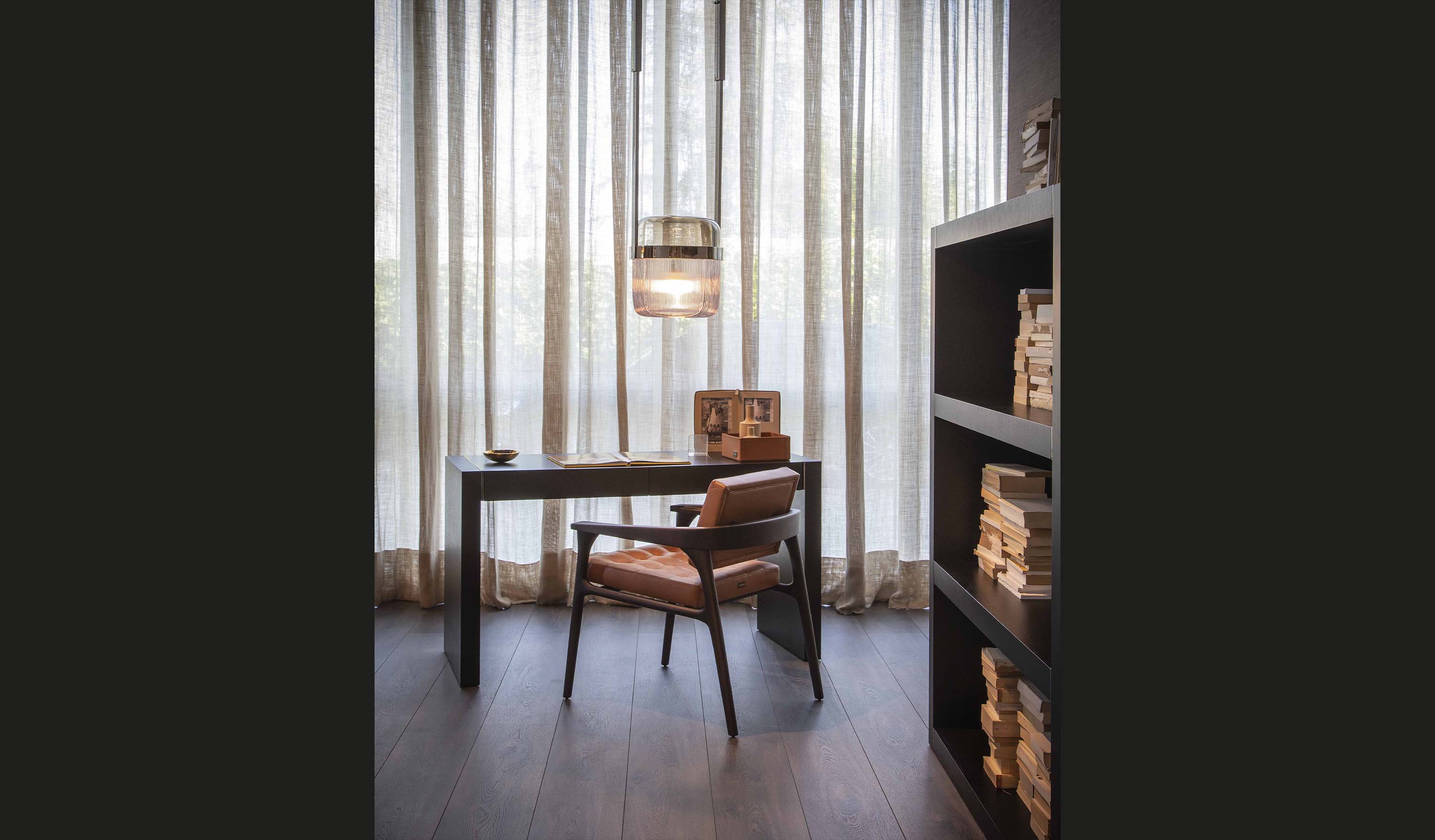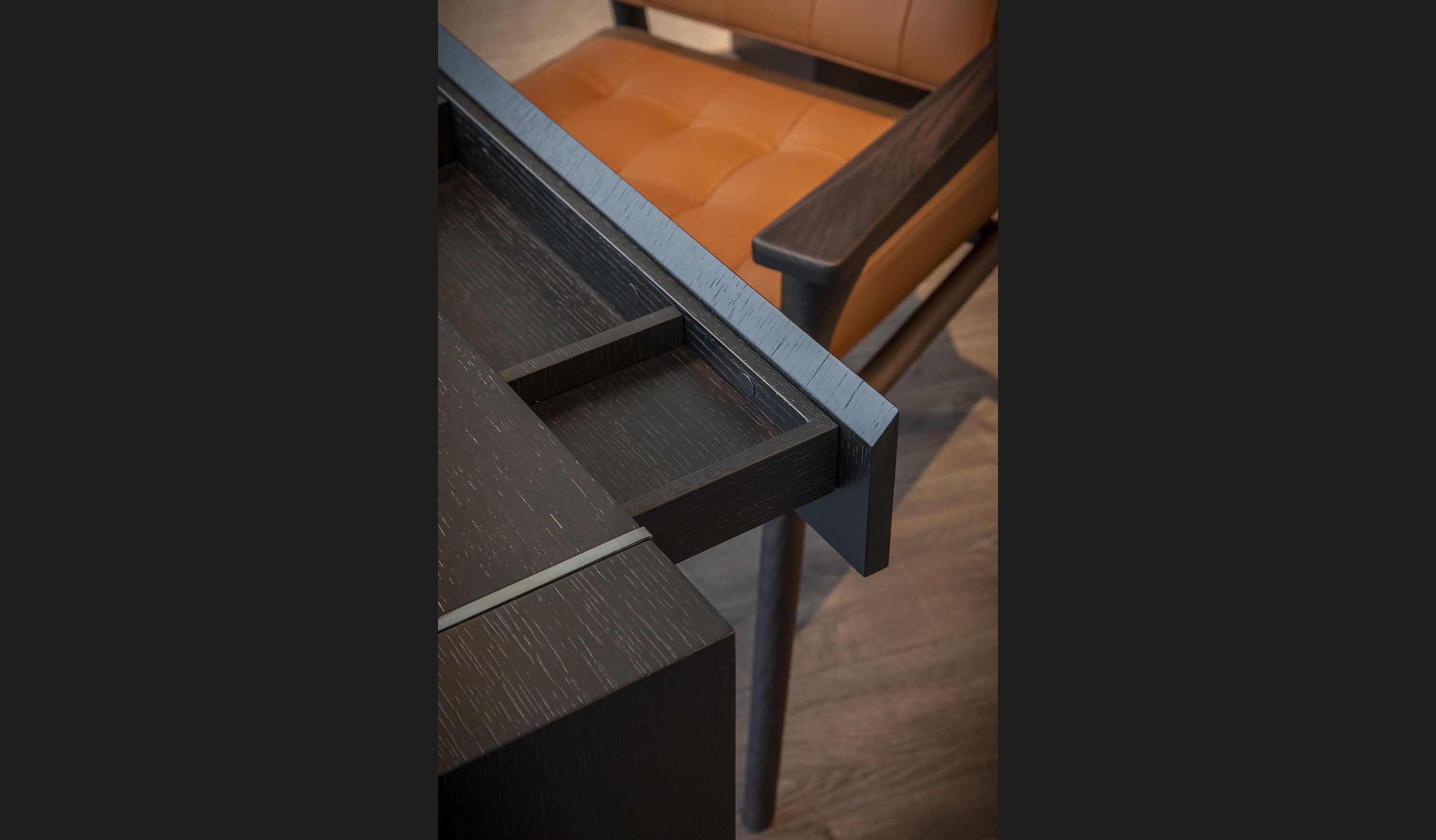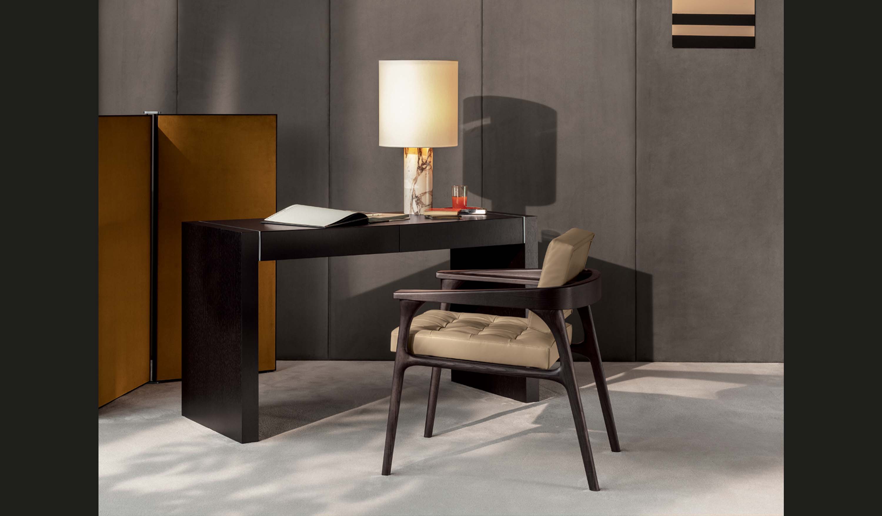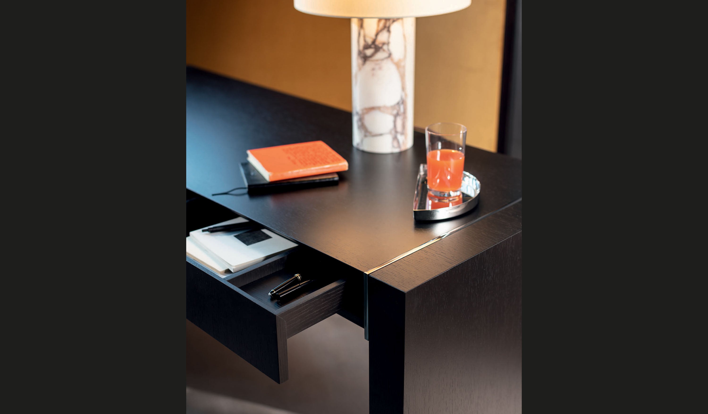 Tutti gli elementi, dalla libreria alla consolle, dal comodino alla cassettiera fino ad arrivare al desk, sono contraddistinti da proporzioni attentamente bilanciate, da linee pulite e geometriche, da dettagli leggeri e preziosi in un connubio minimalista di legno e metallo.