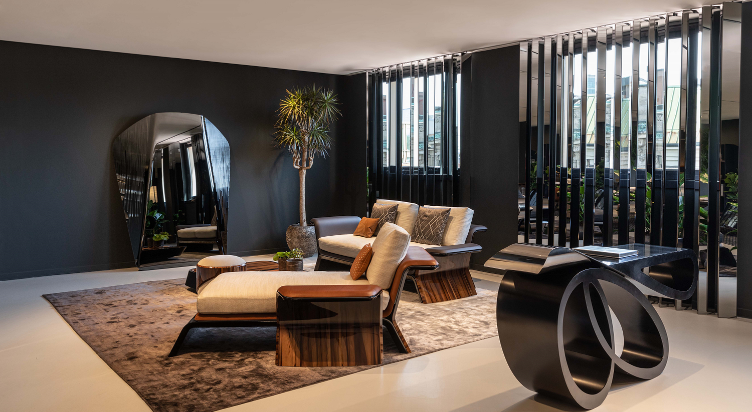 The contrast between the building’s neoclassical architecture and the daring interior of the Atelier is complimented by the use of key elements such as stone, mirrors and leather, which provides the setting for the furniture of the Bentley Home collection.