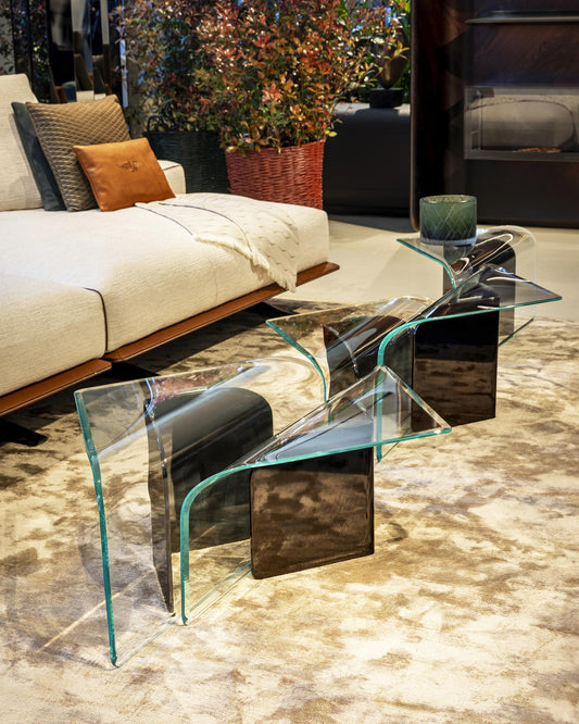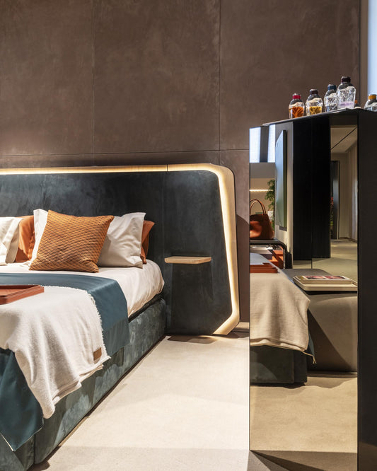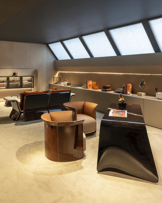 The central space of the Atelier is crossed by rays of light and unexpected reflections, which shine from the large windows onto the furnishings of the collection, moving through a wall entirely framed by mirrors.
