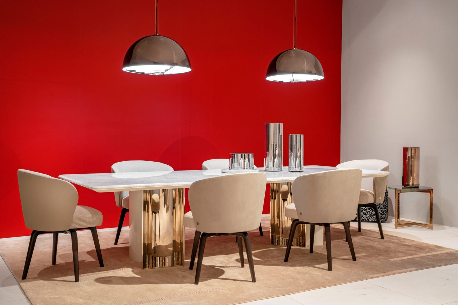 The new collection includes upholstered items and side tables, carpets and lamps, cabinets and bar cabinets, dining tables and chairs.