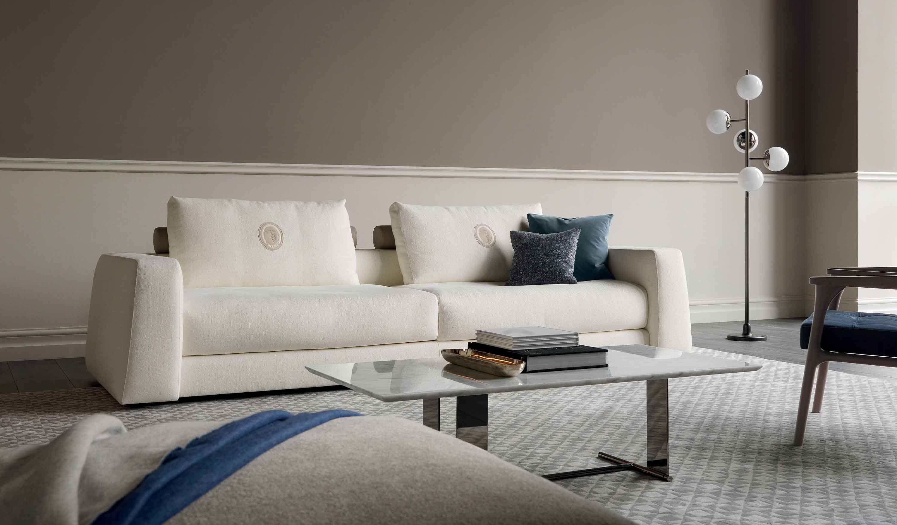 The distinctive cylindrical leather roller is both decorative and functional, providing ergonomic support for the back cushions while offering a comfortable shoulder rest. Upholstered in soft leather, it is artisanally finished and sewn, fastening to the frame with a strap trimmed with a metal buckle bearing the Trussardi logo. The classic oval heat-stamped logo recalls the sartorial elegance of the Maison's belts for men.